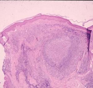 Patients in Europe have been seen with a lesion of skin referred to as Borrelia lymphocytoma or lymphadenosis benigna cutis, usually involving the ear lobe, lateral neck skin, or areola of the nipple. The histology is instantly recognizable by a marked dermal infiltrate of lymphocytes and other mononuclear inflammatory cells totally, or nearly totally replacing the dermis, with well-formed germinal centers (Fig. 3), as seen in lymph nodes or tonsillar lymphoid tissue, hence the term lymphadenosis. This is a remarkable lesion clinically and pathologically and is not always caused by Borrelia infection. When it is, however, the clinician should look for the spirochetes, which can be seen by silver stains. Other examples of early disseminated infection, which may be seen days to weeks following tick bite, include meningitis, radiculoneuritis, encephalopathy and Bell's palsy.