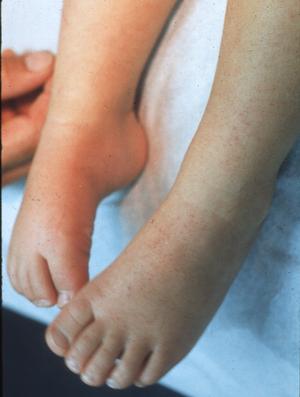 Late disseminated infection of the skin is called acrodermatitis chronica atrophicans and occurs mainly in Europe. Histopathology in these cases is characterized by transdermal, comparatively dense and diffuse mononuclear inflammatory cells, including plasma cells, in association with dilated lymphatics (Fig. 6). The degree of these findings varies from case to case, but dermal inflammation is significantly greater than that of erythema migrans. Spirochetes can be demonstrated in many of these pathologic lesions except recurrent synovitis, which may be a molecular cross-reactive phenomenon. Spirochetes are always difficult to demonstrate in patients who have had prior or concurrent antibiotic therapy.