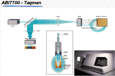 This technique is a perfect tool to use when small amounts of DNA are present in a sample and the researcher is only interested in the presence or absence of this particular DNA. However, quantification of DNA is very difficult and time consuming when this is the only method available. In an attempt to address this issue, Applied Biosystems recently introduced the ABI 7700 Sequence Detection System (Fig. 1).[1] This tool measures DNA during amplification using a probe (short piece of DNA) labeled with two fluorescent dyes. As long as both dyes, the reporter and the quencher dye, are attached to the probe, no signal is emitted.