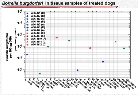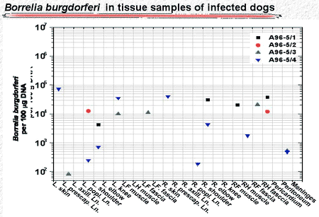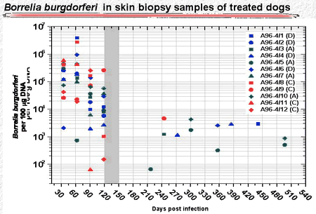 In untreated dogs, the number of organisms declined during the 300 days following infection to undetectable levels in skin punch biopsy samples (Fig. 3). But the spirochetes did not disappear. More than 500 days after infection, spirochete DNA was found in skin and deeper tissue, but the number of detected organisms was 100- to 1,000-fold less than during the early stage of infection (Fig. 4).